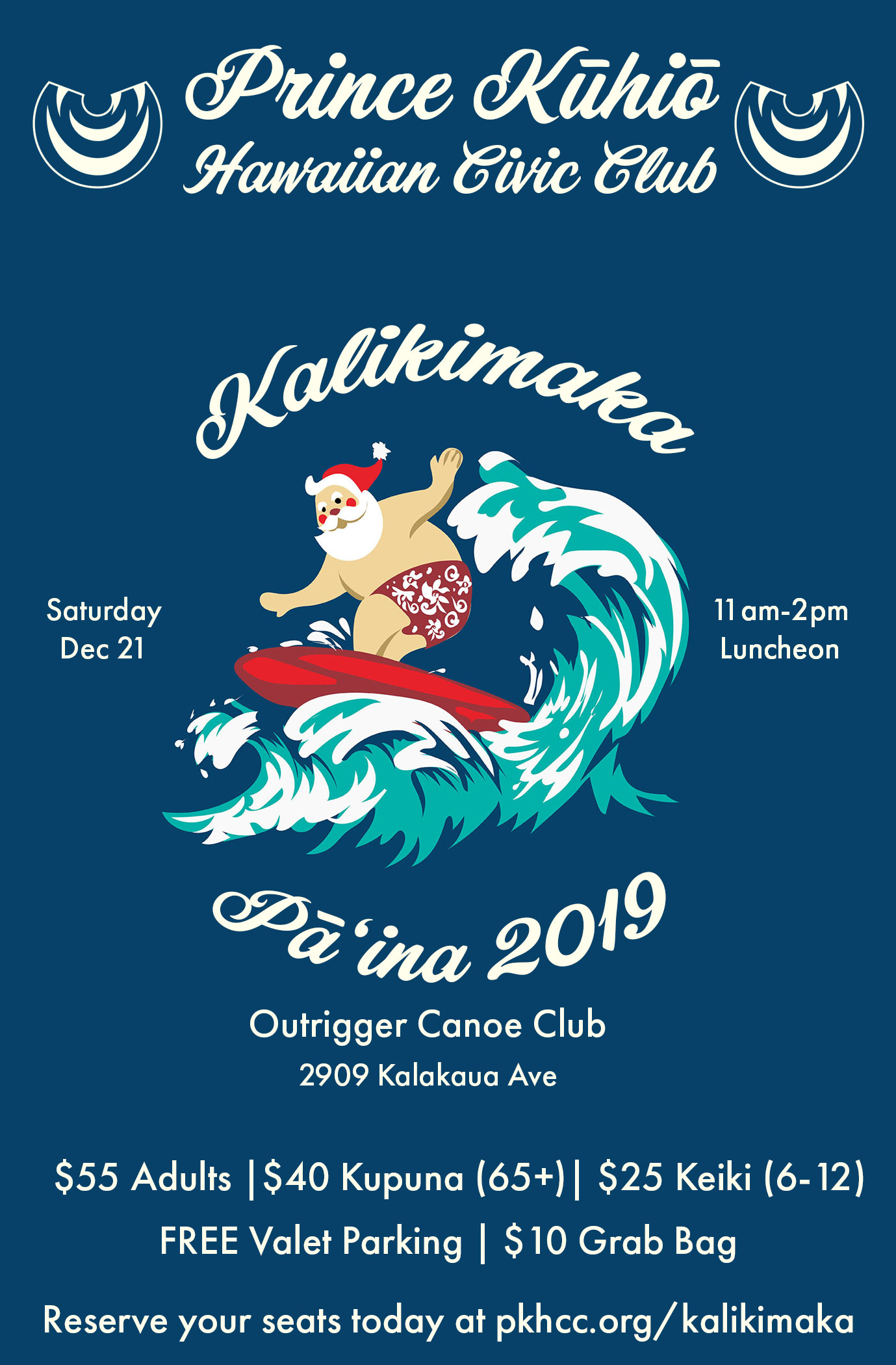 2019 PKHCC Kalikimaka Pāʻina by Kuni Agard | Nov 16, 2019 | 0 comments Calendar Tickets Add to Calendar Add to Timely Calendar Add to Google Add to Outlook Add to Apple Calendar Add to other calendar Export to XML When: December 21, 2019 @ 11:00 am – 2:00 pm Pacific/Honolulu Timezone 2019-12-21T11:00:00-10:00 2019-12-21T14:00:00-10:00 Where: Outrigger Canoe Club 2909 Kalakaua Ave Honolulu HI 96815 Cost: $25-55 Submit a Comment Cancel replyYou must be logged in to post a comment.